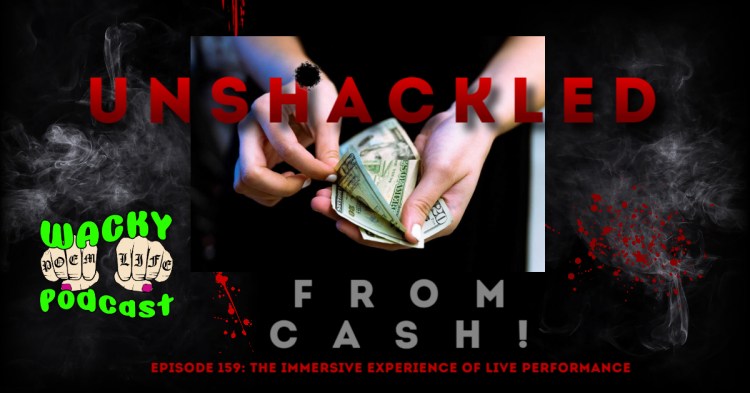 Episode 159: Unshackled from Cash: The Immersive Experience of Live Performance brings you musings and profundity (of a sort) as we discuss poetry readings, live theater, and live performances, in general. This episode was inspired by a line from Nicole Stellon O’Donnell: “Unshackled from cash, poetry can go wherever it pleases.”