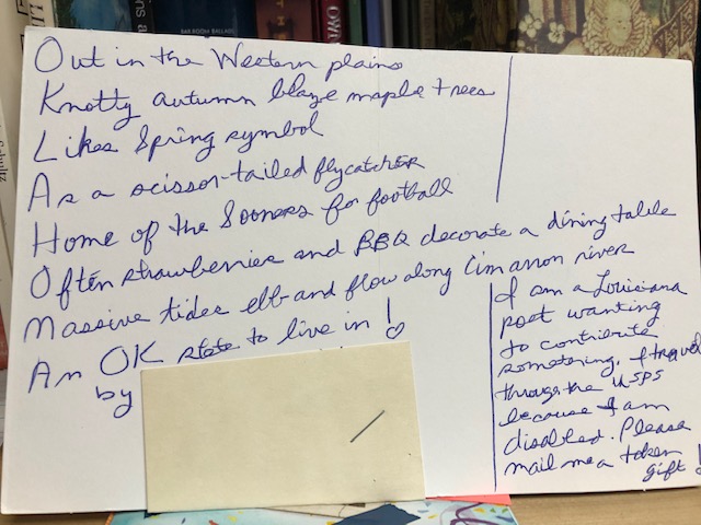 Episode 47: Oklahoma Acrostic is about a Louisiana poet who sent us a card in the actual postal mail with an Okie poem on it, a form mastered by Arnold Schwarzenegger, maybe. Who knows? OK!